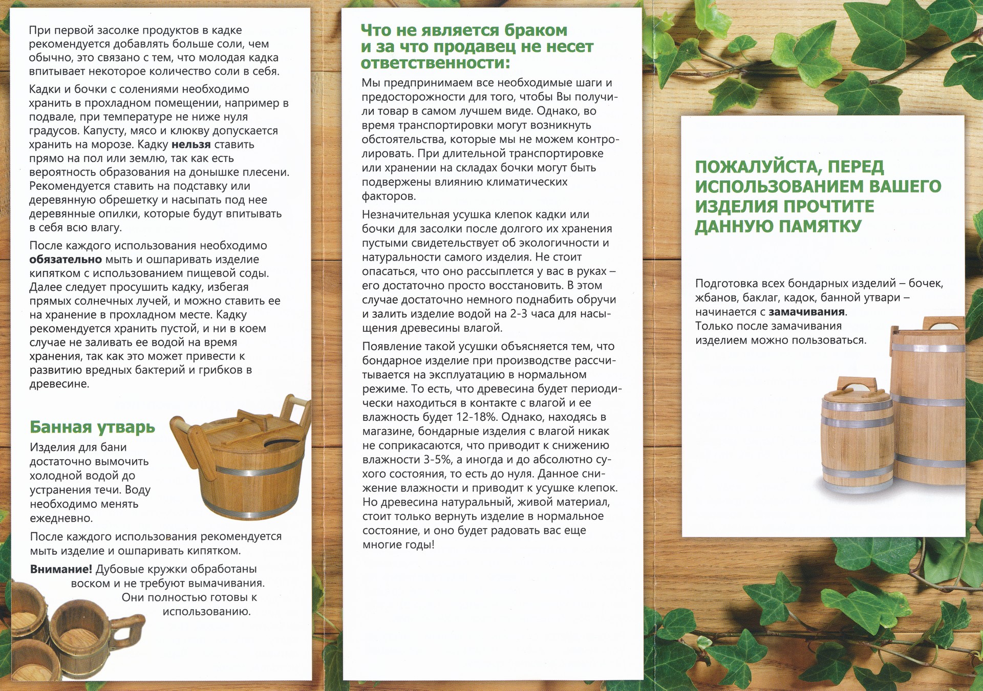 Претензии к внешнему виду бочек (кадок) при дистанционной продаже принимаются только до начала заливки (подготовки) бочек (кадок). Ознакомление с данной информацией и приемка бочки (кадки) по внешнему виду означают, что покупатель дубовой бочки (кадки) полностью осознаёт, что приобрел качественную дубовую бочку (кадку), а также соглашается с тем, что возникающие в процессе подготовки и использования бочки (кадки) изменения состояния древесины бочки (кадки), появление течи, заломов не являются дефектами, подлежащими устранению за счет продавца, и могут быть устранены силами покупателя или третьих лиц и сторонних организаций.
